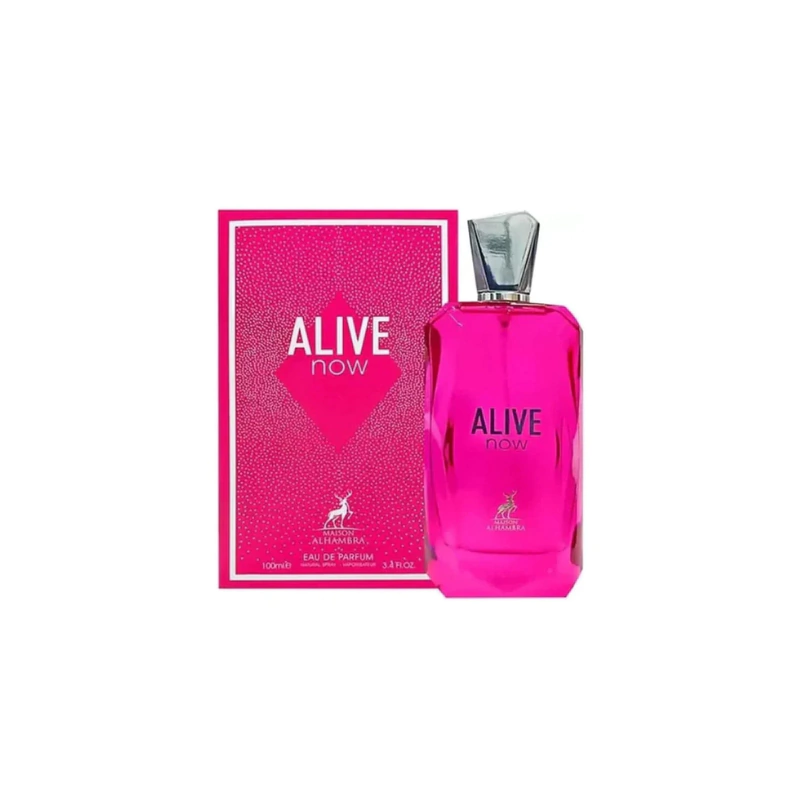 Alive Now de Maison Alhambra es una fragancia de la familia olfativa para Mujeres. Alive Now se lanzó en 2023. Las Notas de Salida son hojas de violeta, frambuesa y lichi; las Notas de Corazón son rosa, peonía y jazmín; las Notas de Fondo son vainilla y almizcle